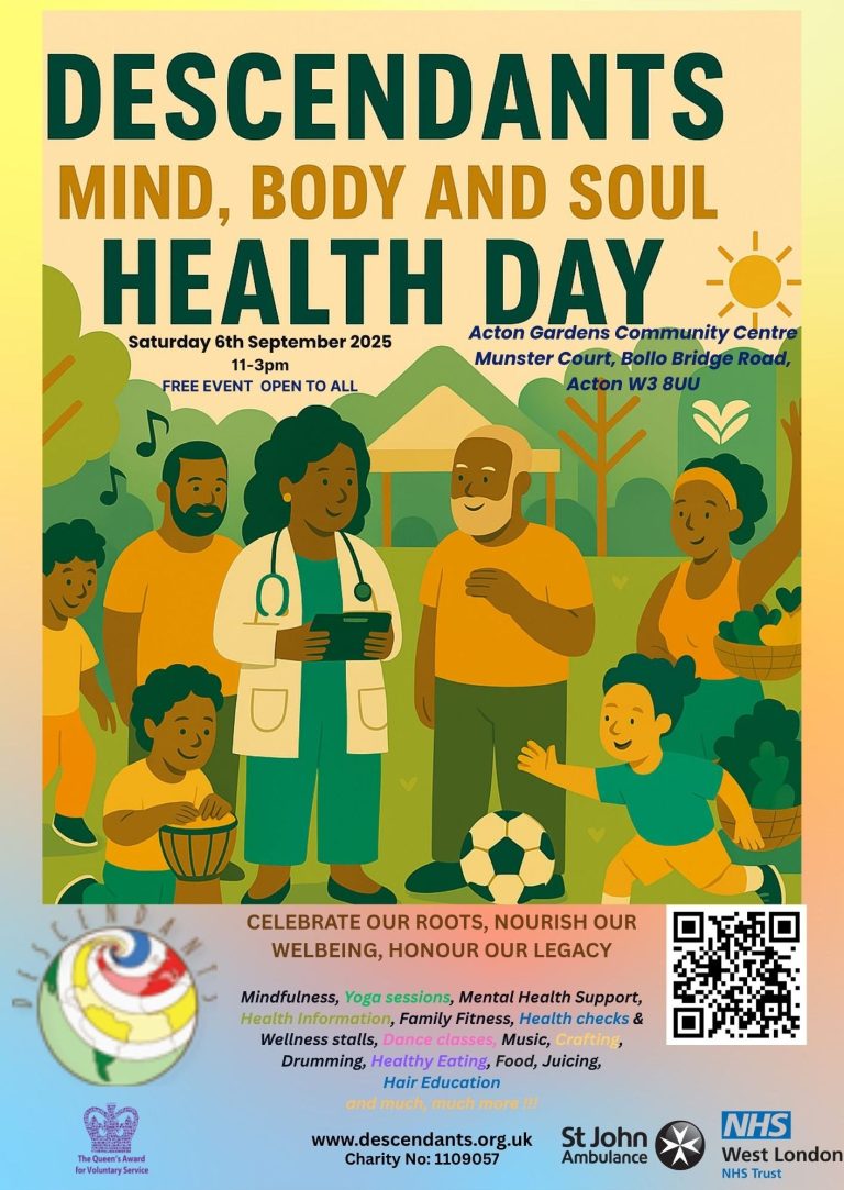 Come and join us for the second leg of our project. Descendants’ Mind, Body and Soul Health Day is a free, vibrant celebration of wellness, culture, and community in the heart of Acton and Ealing. Rooted in African and Caribbean heritage, the event brings people together through yoga, health checks, mental health support, crafting, fitness, and nutritious food, empowering local families and friends to live well and thrive.
